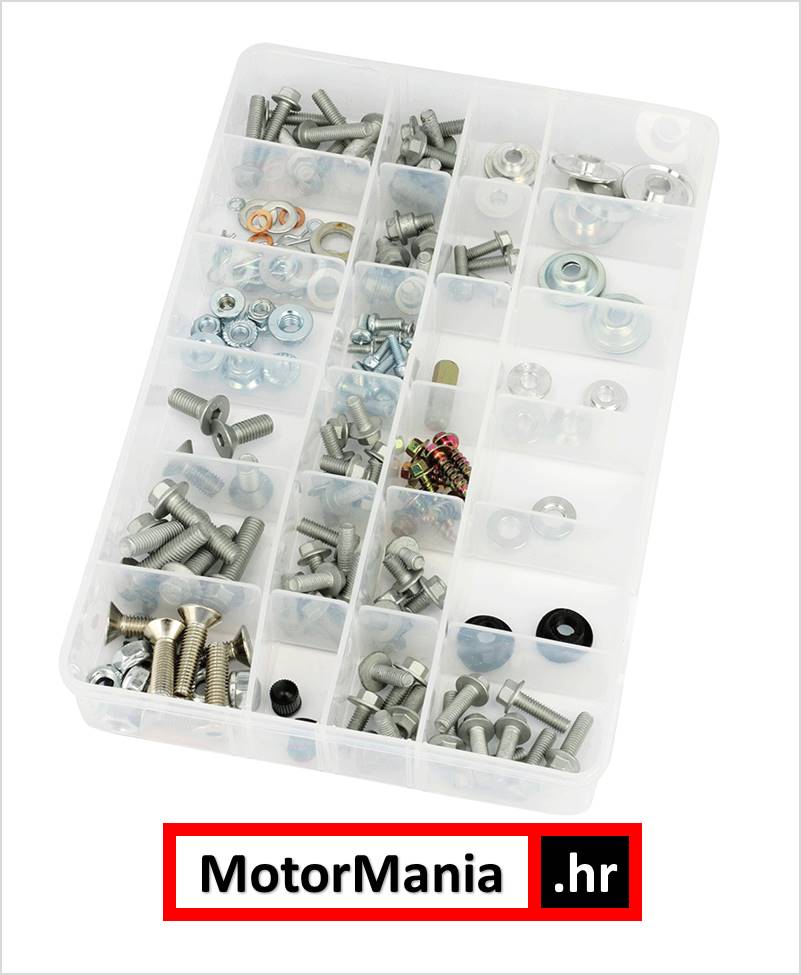 Komplet 158 dijelova uključuje savršen izbor tvornički veličine imbusa, vijaka, matica, podloški i dr.. Specifičan hardver za KTM i dr. EURO enduro i MX motocikle.